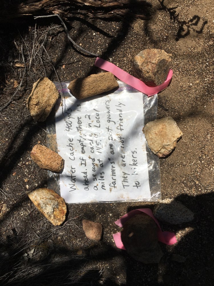 Windy night. Tent held up. Got moving at 5:45. In the water report it said a potential 31 mile dry stretch but we came across three water caches.