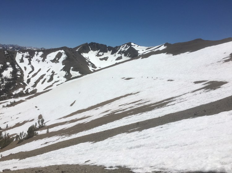 Got moving a little after six. Today was much easier than yesterday. It only got difficult going up and down towards Sonora Pass. Lots of snow fields on steep slopes.