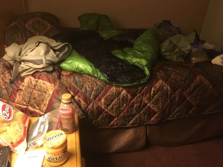 Went to dinner with Sonic and her mom. Had a burger and potato wedges. Back in the room I dug into the chip and dip which I kind of regret buying because I was full. Spent the rest of the night watching tv and using wifi. I’m really hoping my feet heal up and hold up for the rest of the trail.