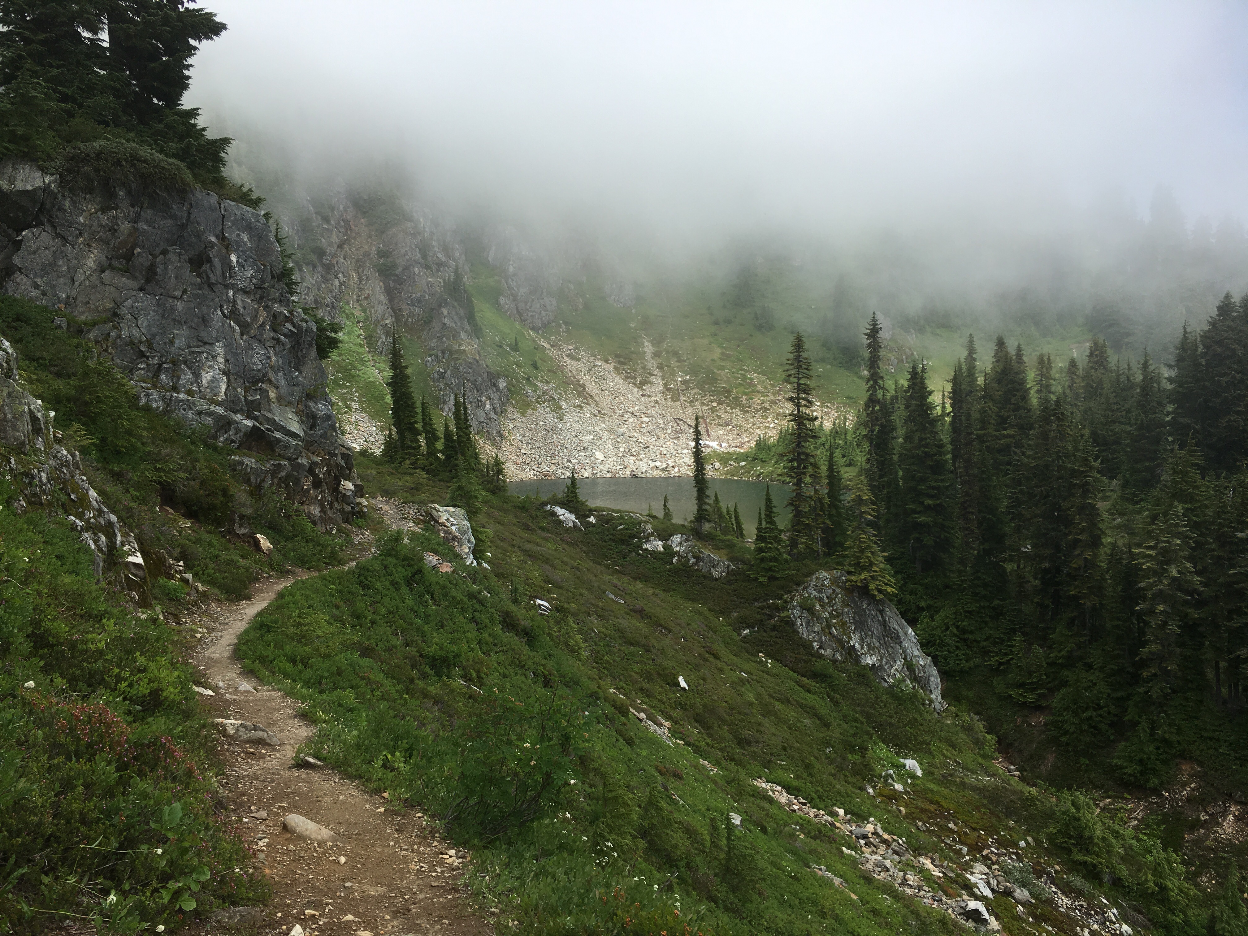 Planned on getting up at 5 but it was raining so I got up at 6. The first four hours or so sucked. I was soaking wet from all the wet brush and it was still drizzling. The weather was suppose to clear up and it did around 11 but the clouds and fog remained. For a bit I actually saw some mountains and it looked amazing. Northern Washington is suppose to be one of the most beautiful sections of the PCT and I’m missing it because of the weather.