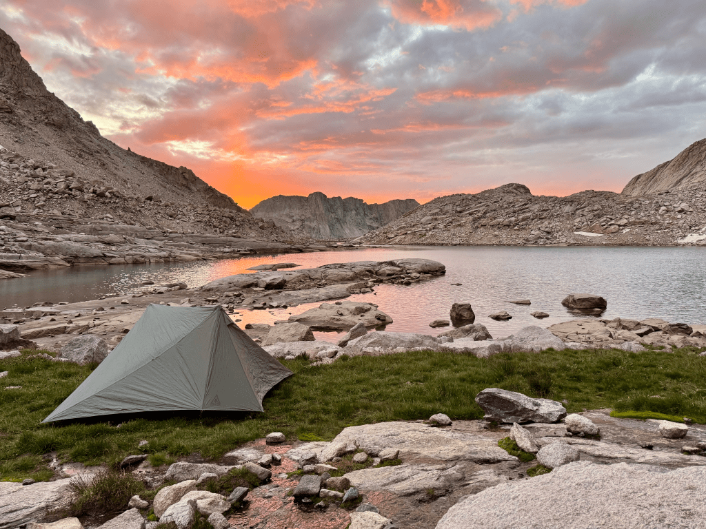 I started making my way to Chimney Rock first which is at 12,600ft and then Wind River Peak at 13,200ft. The climb wasn’t that steep but obviously slow moving as there is no trail. I could feel my heart and brain pounding pretty good which means I’m feeling the elevation. This was why I used the GDT as a warm up, the highest point there is only 8,500ft though. I made it to Chimney Rock at 6:15 and from the base of Wind River Peak it was 600ft in 0.4-miles. The entire final climb was boulder hopping and I summited at 6:45. Had it all to myself and it wasn’t even windy up there. Great 360° views as I expected. I couldn’t stay long because daylight was running out and I had one notorious section remaining, the West Gully. I heard this steep descent is the only time Skurka actually draws a line and tells you where to go on the map. It was indeed very steep but that isn’t the issue. The issue is the entire way is on extremely loose dirt and rocks, really loose. The first half wasn’t bad but the final half got a bit sketchy. A few times I would ride a wave of dirt down like a surfer. Listen to me when I say you cannot trust any rock in this section, even the big ones are often loose. The movie 127 Hours was on my mind the whole time. I did not want to end up in a similar situation pinned under a rock. Eventually I made it down and I shot a point back up top on Gaia and it said in 0.2 I lost 650ft of elevation, that’s steep. From there it was a lot of rock hopping until I reached an unnamed lake. I lucked out and found a flat grassy spot right at 8PM. I was worried I’d be hiking into the night trying to find camp. This spot could fit two tents and overlooks the water which gave me a great sunset to watch. The exact location is 42°42.81’N 109°8.35’W. This camp is at 11,200ft so it’s gonna be a chilly night. I do not plan on sleeping well due to elevation. I am also sleeping with my filter in case it gets below freezing. I’m glad I did both Wind River Peak and the West Gully descent on day one with a full pack. The peak is the only climb that’s over 2K (2,500ft) and the West Gully is considered by some (even Skurka) to be the sketchiest section of the WRHR. Nice to have them both behind me.