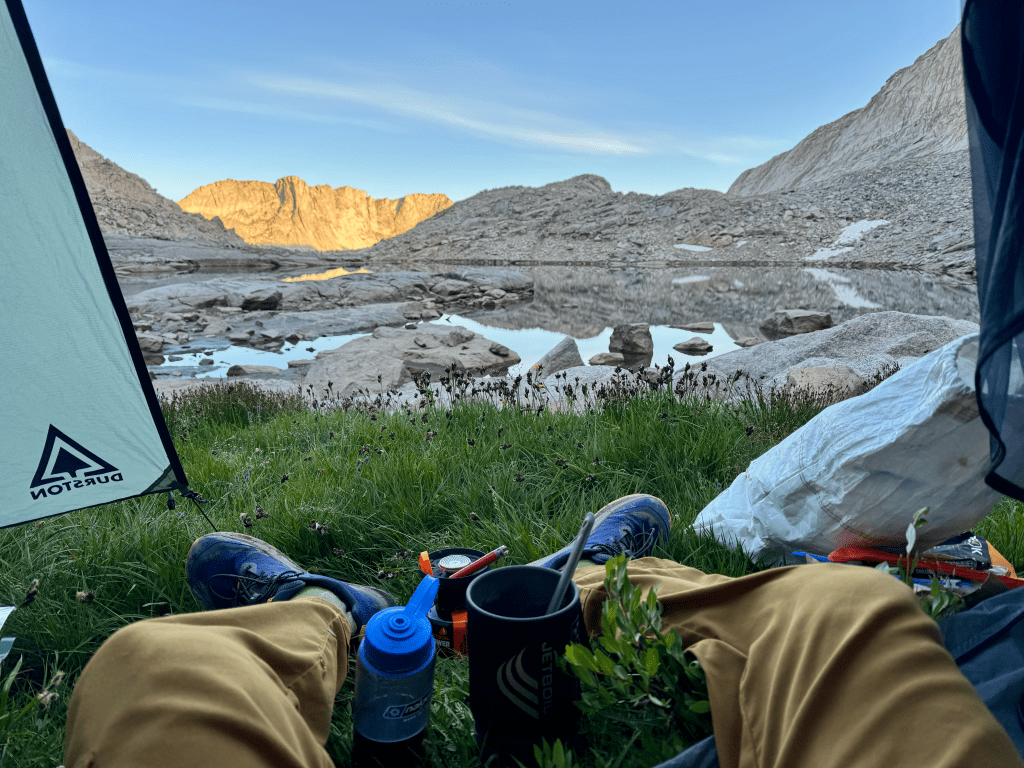 If you’re camped at Golden Lake around mid-August that is the exact time the sun will crest over the horizon and illuminate Golden Lake and the surrounding mountains. The way Golden Lakes is constructed is that there’s mountains and ridges to the north, south, west, but not the east where the sun rises. After 12,000 miles it’s one of the most epic sunrise I’ve witnessed on trail. The trip isn’t over yet but I already know this is one of the highlights. So if you’re lucky enough to be camped here make sure you wake up at 6:00 – 6:15 depending on how long it takes you to get out of your tent. You don’t wanna miss it. I found a nice flat rock in front of the lake to enjoy breakfast. Doubled up on coffee and had an extra packet of oatmeal.