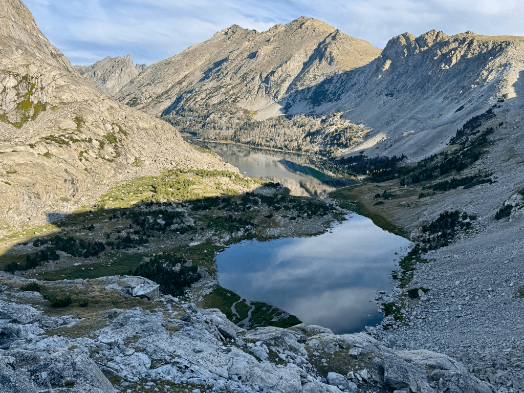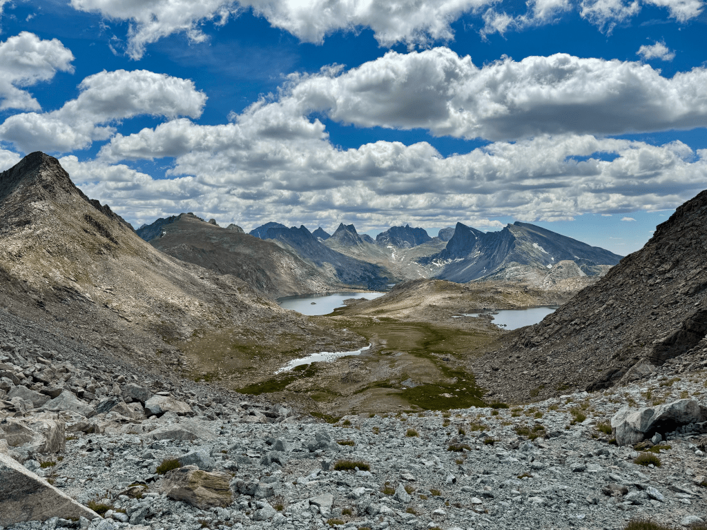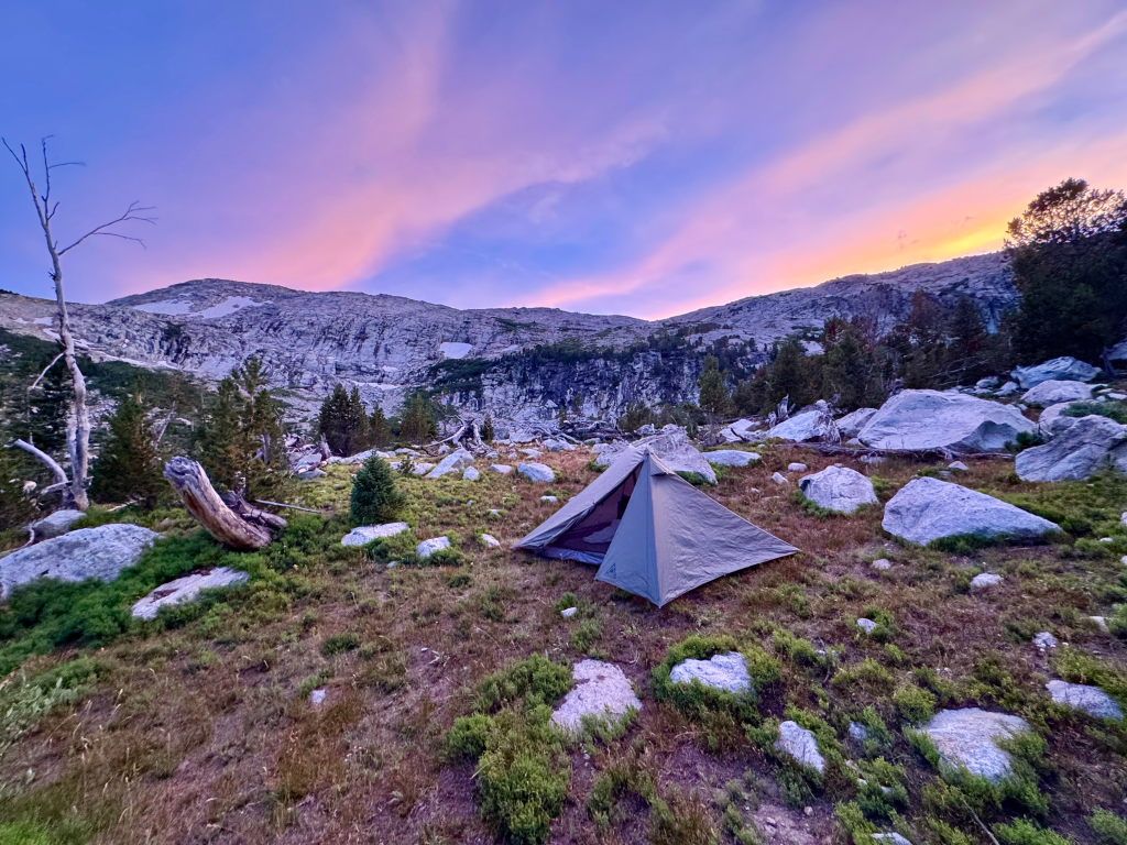 The trail going up Jackass Pass was frustrating. Every time I thought I was close I wasn’t. The trail kept twisting and turning and going up and down. Eventually I made it at 12:15 and had my first view of Cirque of the Towers since I hiked the CDT in 2017. Hard to believe it’s been almost eight years to the day since I’ve been there. Time flies. The Cirque is one of the most scenic parts of the entire 3,000-mile CDT. It’s an alternate that’s pretty much the unofficial main route because everyone does it. It sucks that both times I’ve been here I was in-and-out very quickly. One day I gotta camp there for a couple nights. The next pass was New York Pass to the west of Texas Pass which is where the CDT goes. The worst part about this pass was the boulder hop to get there. I should have stayed east of the stream and then crossed over. The final 0.1 had 400ft gain but it wasn’t bad. Footing was good for the most part and before I knew it I reached the top at 2:15. Epic views all around, especially looking down on Lonesome Lake and Jackpass Pass. On the other side was Billy, Barren, and Shadow Lakes with Bair Peak in the background. The climb down was pretty easy aside from some loose rocks. At the bottom I connected with Shadow Lakes Trail and then Pyramid Lake Trail. At 5PM I took my dinner break at the north end of Skull Lake before pushing on. I ran into four others who are doing Adventure Alan’s WRHR, that’s now thirteen people I’ve met doing this route. My plan was to camp right below Raid Peak Pass and from my dinner spot it required some cross country travel. Most of it was pretty enjoyable since it was flat with great views. I followed the East Fork with Mount Geikie to my left, Raid Peak and Mount Bonneville in front, and Tower Peak, Mount Hooker, Pyramid Peak to my right. I made it to a flat top at 7:30 about one mile east of Raid Peak Pass and managed to find a great flat spot for my tent. The ground was nice a firm when I put the stakes in, always a good feeling. Nothing worse than rocky ground when trying to pitch. I am two days in an over 1/3 done with the route. I’m far ahead of schedule which is good. I had seven days to complete the WRHR so all I needed was 14mpd. Currently I’m nine miles ahead so I have some wiggle room