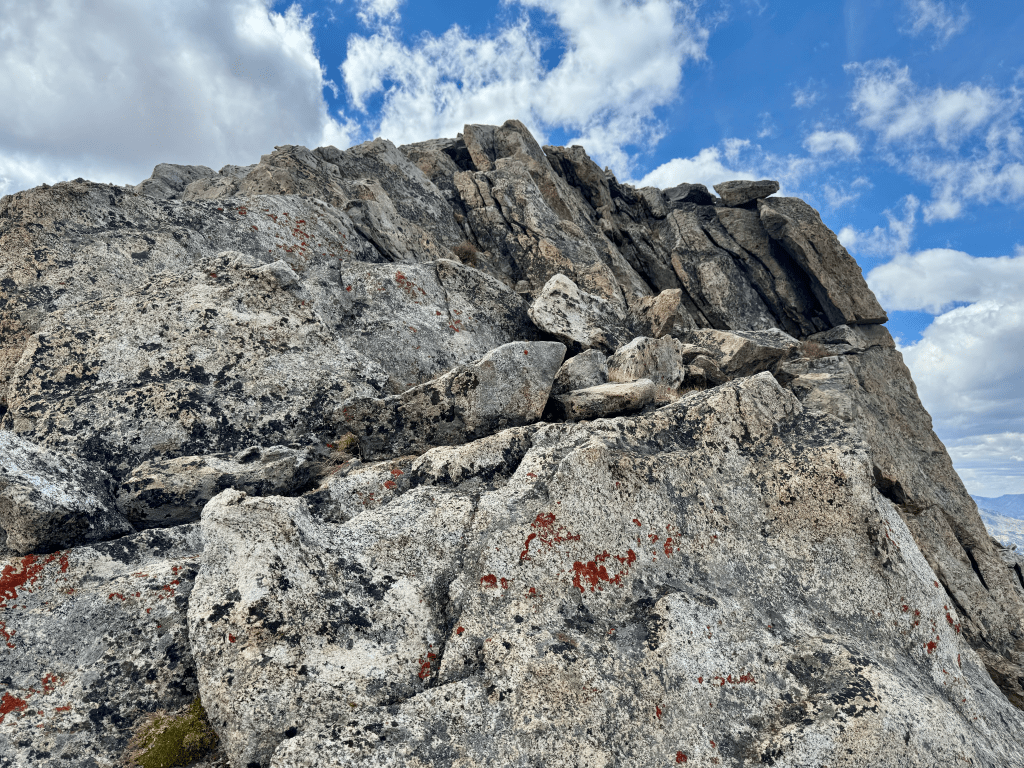 After about fifteen minutes I started making my way up keeping a watchful eye on the weather. I stayed to the east of the ridge to avoid the wind. I was 400ft from the summit when dark clouds rolled back in. I found another spot to hide and waited as I heard the sky rumble above me. I took the time to write this while I sat there. I got a little bit closer and was 275ft from summit when dark clouds again rolled in, terrible timing. The sky was rumbling so there was no way I was going further, I again found a spot to sit and wait. I grew impatient and crept forward. I got to what I thought was the summit but it wasn’t, wtf. I hauled ass to the real summit and hopped up there real quick and the wind immediately blew my hat and sunglasses off. That’s a sign I need to gtfo. On the way down there was a woman going up, I couldn’t believe it. We talked for a couple minutes and parted ways, hope she made it. On the way down I busted my ass again and then found a nice flat spot for dinner while the storm rolled over.
